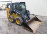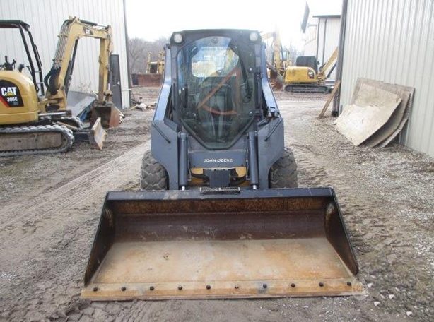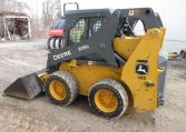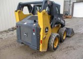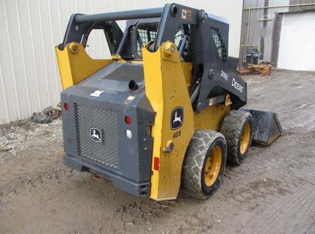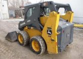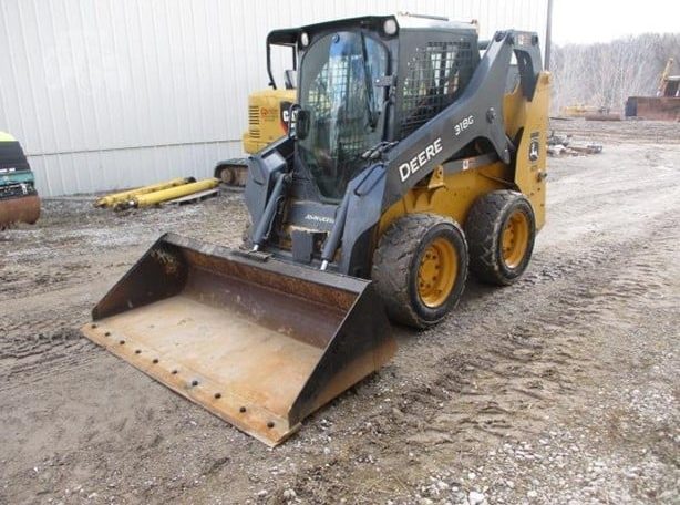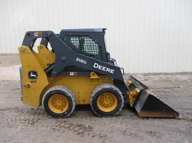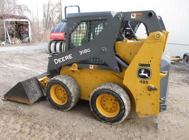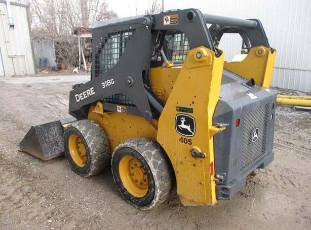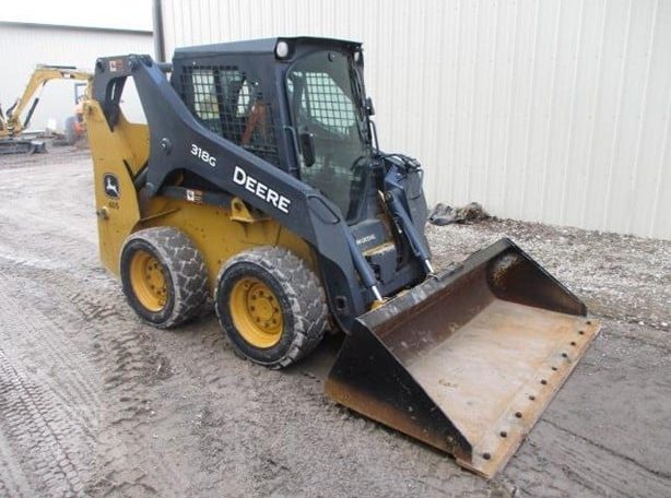 Lower hour 2018 Deere 318G skid steer loader with auxiliary hydraulics,10×16.5 tires, Yanmar engine, and 6,481 lbs. operating weight.